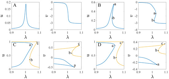 Figure 12 shows the transition sets of the system at . The transition sets divide the parameter plane into four persistent regions. Figure 13 shows the projections of the bifurcation curves corresponding to different parameter regions on the planes of and . To illustrate the difference between the bifurcation curves, we define three key points as a, b, and c, which are the turning points of the curves. As can be seen, the system has one solution curve corresponding to the corresponding parameters in regions A and B. A single solution for u and v corresponds to any value of in region A, while in region B, between points a and b, u and v have three solutions. The system has two solution curves corresponding to the parameter regions C and D. In region C, point b is to the left of a, and there are five solutions between a and b. In region D, point b is to the right of point a, and a single solution exists between a and b.
