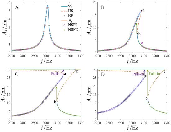 The amplitude–frequency curves in the driving direction correspond to different persistent regions in Figure 12, where SS is the stable solution, US is the unstable solution, BP denotes the bifurcation point, is the pull-in boundary amplitude, NSFI is the numerical solution as the frequency is increased, NSFD is the numerical solution as the frequency is decreased; (A): , (B): , (C): , (D): .