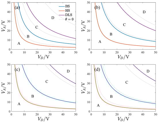 Figure 15 presents the transition sets on the plane corresponding to different inclination angles. Compared with , both the bifurcation set and the hysteresis set shift to the bottom left at and . The gyroscope’s feasible region decreases with the inclination angle’s magnitude. As the inclination angle is increased, the double limit point set gradually shifts to the top right.