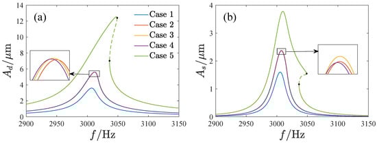 The amplitude–frequency curves corresponding to different DC and AC voltages, Case 1 , Case 2 , Case 3 , Case 4 , Case 5 . (a) The amplitude–frequency curves of the driving direction, (b) The amplitude–frequency curves of the sensing direction.