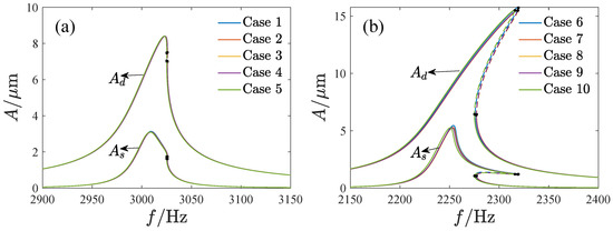 Figure 11 shows the amplitude–frequency curves of the system. By using the fourth-order Runge–Kutta method, the solutions of Equations (18) and (20) are also given to verify the analytical solutions. The results are in good agreement. Note that the amplitude–frequency curves exhibit different dynamic characteristics. In Figure 11a, and have unique solutions corresponding to any value of . In Figure 11b, a jump happens with the change in , while the jump leads to pull-in in Figure 11c. Thus, it is necessary to analyze the effect of the parameters on the bifurcation characteristics.