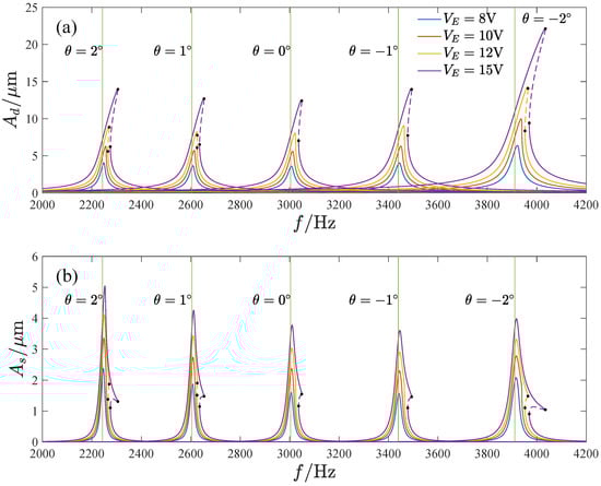 Figure 18 shows the amplitude–frequency curves corresponding to different voltages and inclination angles. It can be seen that as the voltage is increased, the response amplitude increases and exhibits a stronger hardening characteristic. The natural frequency of the gyroscope decreases with the inclination angle due to the reduction in the size of the cross-section of the elastic beams as well as the bending stiffness. The amplitude of the response curves decreases first and then increases with the inclination angle. The maximum amplitude in the driving direction occurs at , while the maximum amplitude in the sensitive direction appears at .