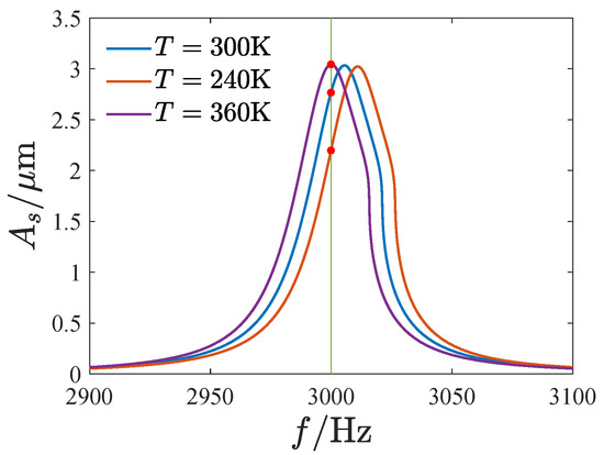 The change in environmental temperature may affect the output of the gyroscope. Figure 22 gives the response curve of the sensing direction corresponding to different environmental temperatures. We also set the linear natural frequency of 300 K as the working frequency. The temperature has a very small effect on the response curve, and the variation in the peak frequency of the curves is less than . However, the temperature significantly affects the output amplitude of the gyroscope (shown by the red dot in Figure 22). Compared with the output of the room temperature (300 K), the output amplitude increased by at 360 K and decreased by at 240 K.