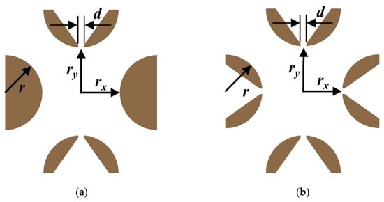 Therefore, with a fixed electrode radius, the effect of varying the field radius and “stretching” the electrodes in the ejection direction on the resolution was investigated by calculating fields and simulating the motion of ions. In view of the harmful high-order fields introduced by slits on electrodes [,], two HreLIT models have been developed for discussion according to the TeLIT with four slits [], one with ions ejection slits on one pair of electrodes only (2-slit model, Figure 1a) and the other with the same slits on all electrodes (4-slit model, Figure 1b). The width of slits (d) was 300 μm. The radius of all electrodes represented by r remained 2 mm. The shortest distance from electrodes to the geometric center (field radius) was rx, and that from the electrodes in the ejection direction was ry.