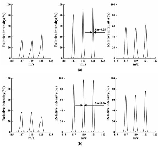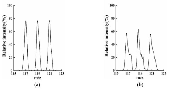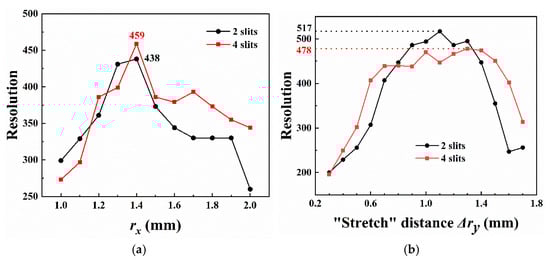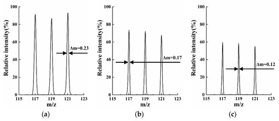 The “stretch” distance Δry kept 0.75 mm (ry = rx + 0.75) and rx was extracted at intervals of 0.1 mm within 1.0~2.0 mm. The mass resolution trends are shown in Figure 2a according to AXSIM calculating the motion of ions at a scan rate of 2250 Th/s. A comparison of the mass spectrum at r/rx = 2/1, 2/1.4, and 2/2 (Figure 3) showed the low resolution and intensity when the rx was extracted at the interval endpoints. Even a significant distortion could be observed in the 4-slit model. For both cases, the comparable maximum resolution with high intensity, 438 and 459, respectively, were measured at r/rx = 2/1.4.