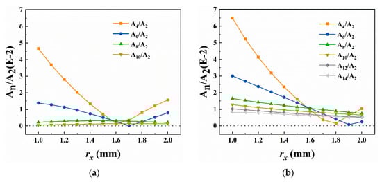 Variation of the high-order fields with rx at Δry = 0.75 mm. (a) 2-slit model; (b) 4-slit model. More slits on electrodes introduced higher-order fields and increased the overall contents and higher rate of changes.