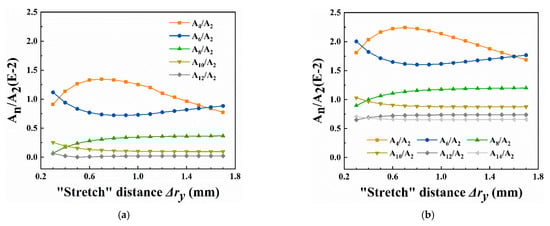 The proportions of high-order fields are shown in Figure 6. In the 2-slit model, the A4/A2 and A6/A2 dominating MS capability kept at a high level and changed apparently during the electrodes “stretching” process. The A8/A2 and higher-order fields were relatively low and varied slowly, so their impact on resolution, in contrast, was negligible. When Δry ranged within 0.9~1.3 mm, where A4/A2 decreased rapidly with A6/A2 increasing slightly, the 2-slit model offered almost the same high resolution. It is probably because the A4/A2 and A6/A2 provided commendable compensation for high-order fields in this case, with 1.2% A4/A2 and 0.74% A6/A2 corresponding to the peak resolution of 517. As for the 4-slit model, the fields higher than A6/A2 remained steady as well. The high resolution could be observed with Δry ranging from 0.7 mm to 1.5 mm, a longer closed interval than in the 2-slit model. The appropriate A4/A2 and A6/A2 could likewise explain these similar trends in Figure 2b.