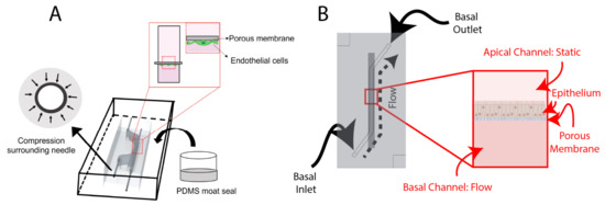 Schematic overviews of: (A) the BBB-on-chip; and (B) the airway-on-chip. Key features of the BBB-on-chip include making molds of higher gauge (smaller outer diameter) needles before adding the I/O needles and sealing the chip using a PDMS moat. Both chips incorporate a porous membrane to separate the channels, with the BBB-on-chip seeding endothelial cells basally and the airway-on-chip seeding epithelial cells apically. Portions of this figure were created using https://biorender.com (accessed on 20 August 2022).