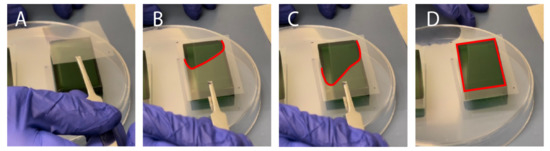 Slowly and carefully placing the transparency film over the uncured, PDMS-filled mold minimizes formation of bubbles: (A–D) depict the different stages of slowly lowering the transparency onto the convex PDMS surface, starting from the top left corner. A red dotted outline is used to depict the area of the transparency film that is in contact with the PDMS.