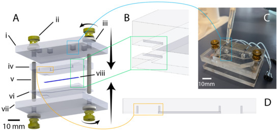 Illustration of chip design and highlighting of critical features. (A) exploded view of chip components (created using SolidWorks): i: 1/4-inch-thick acrylic top clamp, ii: 8–32 brass flanged thumb nut, iii: 8–32 oversized washer, iv: PDMS chip (top half), v: 8–32 threaded rod (1.5” length), vi: PDMS chip (bottom half), vii: 1/4-inch thick acrylic bottom clamp, viii: PET membrane. (B) illustration of corner alignment features to assist manual mating of chip halves during bonding. (C) Illustration of liquid-PDMS reinforcement of fluidic port seal via pipetting of uncured PDMS into top-clamp cutouts. (D) Highlighting of punch guides to assist in the accurate positioning and clear formation of manually punched through-holes for fluidic connection.