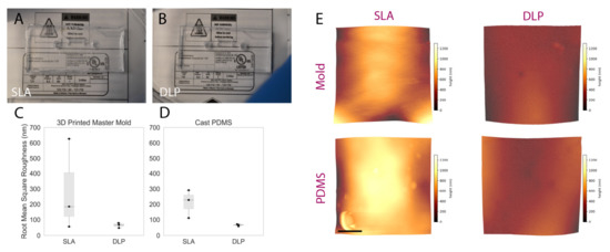 A visual comparison between the PDMS casted in both SLA and DLP molds is shown in Figure 5A,B, while surface roughness characterization is presented in Figure 5C,D. The manufacturer’s stated x-y as well as z resolutions of the DLP printer (MiiCraft Ultra 50) are 30 µm and 5–500 µm, respectively; corresponding values for the SLA printer (Formlabs Form2)—x-y and z resolution—are 140 µm and 25–100 µm. The z-resolution is user-selectable, and the values employed during mold fabrication were, for the DLP and SLA, 30 and 25 µm, respectively. The DLP printer used in this work was made specifically for PDMS casting, as the PDMS master mold resin is made with methacrylated monomers and oligomers and the light engine is optimized for this resin, allowing for an improved surface finish and minimal contact inhibition of PDMS curing (common in other 3D printing resins due to photoinitiators present in those resins) [42]. The resin in a DLP printer is cured layer-by-layer using a light projector and not point-by-point using a laser beam as in a SLA printer. We hypothesized that the difference in resolution between the two printers, as well as the layer-by-layer curing process, may be expected to contribute to reduced roughness in the printed molds. Figure 5A,B, illustrated that a PDMS microfluidic device casted on the DLP printer exhibits improved optical clarity compared to the PDMS microdevice that was casted using an SLA mold, likely due to the decreased scattering resulting from lower surface roughness of the DLP-printed mold. Measured surface roughness, correspondingly, was generally lower on the DLP-printed mold. Average RMS (root mean squared) surface roughness ( standard deviation over three areas measured) achieved using the DLP printer for the mold and casted PDMS were 64.7 15.8 and 65.3 6.7 nm, respectively. When using the SLA printer, mold and casted PDMS RMS surface roughness were 288.9 298.9 and 209.63 91.5 nm, respectively. A one-sided Mann–Whitney U test was performed to compare RMS roughness across both the DLP and SLA molds as well as the PDMS cast therein; the p-value associated with the comparison of molds was 0.2, while for the cast PDMS p = 0.05. Although these results did not indicate statistical significance over the presented measurements, this might be attributable to insufficient sample size (particularly impactful in non-parametric statistical tests), as we qualitatively observed less leakage and improved optical transparency with PDMS fabricated using the DLP printer.