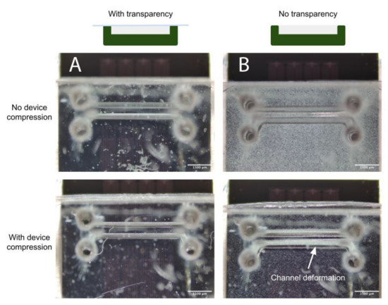 Concerns surrounding non-uniformities in PDMS microdevice thickness include the increased likelihood of channel deformation under compression, commonly employed to augment fluidic seals and integrity for organ-on-chip applications (as discussed in the Airway-on-Chip subsection of Section 2.2.2, pertaining to clamp design) [33]. Figure 7 illustrates this phenomenon; channels in microfluidic devices fabricated without a transparency (less uniform in thickness) exhibit greater deformation under comparable compressive load. In quantifying the flatness uniformity, we observe much larger inter- and intra-device variability for devices fabricated without transparency than those fabricated with our transparency method (quantified interquartile range of 125 µm with transparency, and 1.225 mm without in Figure 6C; interquartile range of 4 µm with transparency, and 55 µm without in Figure 6D.