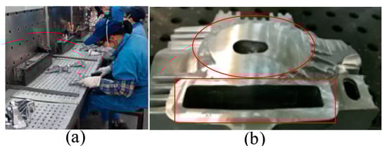 Casting post-processing site. (a) grinding scene (b) grinding effect (Based on practice, vibration can easily occur when grinding the red area of the cavity). During manual grinding, there is a long period of intense vibration exposure in the grinding process of hand-held workpieces, which causes arm vibration syndrome and harm to workers’ physical health []. Frequent vibration will also cause harm to the grinding workpiece and tools, because the tools and workpiece are vulnerable to damage during large vibrations. During mechanical grinding, a large holding force is needed to fix the casting workpiece, and this force may damage the casting part. A sensing device subject to large vibration interference cannot accurately capture the workpiece to be polished, and acquired data that contains a large amount of noise will affect the grinding accuracy. Large vibrations result in a large amount of noise for the control of the end-effector and have an impact on the stiffness of the equipment. Large vibrations also have a significant impact on the clamping of the workpiece, which means the workpiece can easily become loose. Large vibrations can also result in the splashing of hot debris.