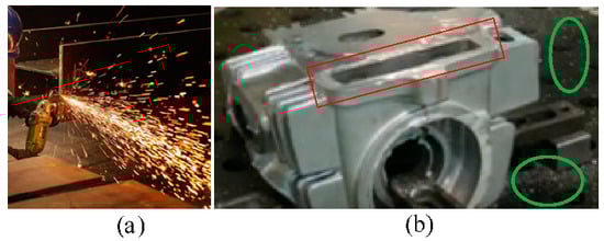 In the process of grinding, the friction between the grinding head and the workpiece produces a large quantity of hot debris splashing, as shown in Figure 2. During manual grinding, a large quantity of thermal debris can block the sight of workers and seriously affect the accuracy of the workpiece. A large quantity of thermal debris having a high temperature can cause burns on the exposed skin of workers on site. A large quantity of uncontrolled high thermal debris can cause vision loss to the eyes of workers on site; debris accidentally flying into a human eye can seriously damage the lens and cause blindness []. Therefore, the grinding process is very precise and seriously affects the work efficiency. During mechanical grinding, the splashing of high-caloric debris will cause scalding on the surface of the nearby equipment, and an improper process can lead to the formation of chip tumors on the surface of the workpiece. High-caloric debris can also easily damage the outer layer of the power supply and the signal line. For the intelligent grinding system, high-caloric debris can interfere with the ability of the intelligent sensing equipment to obtain information. As a result, the obtained information may be incorrect and, therefore, not applied. This may lead to inaccurate pre-judgment and inaccurate planning strategies, causing sharp sound pulses at a minor level, or directly damaging the grinding equipment at a serious level.