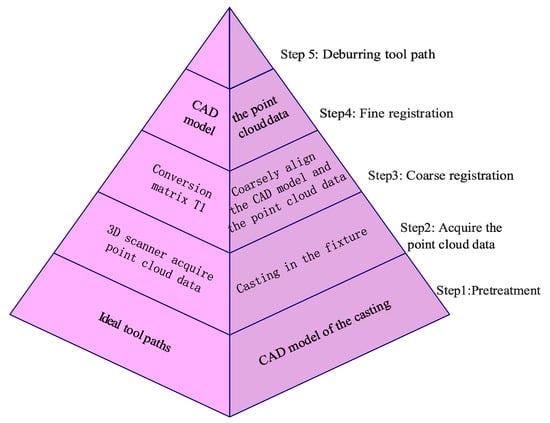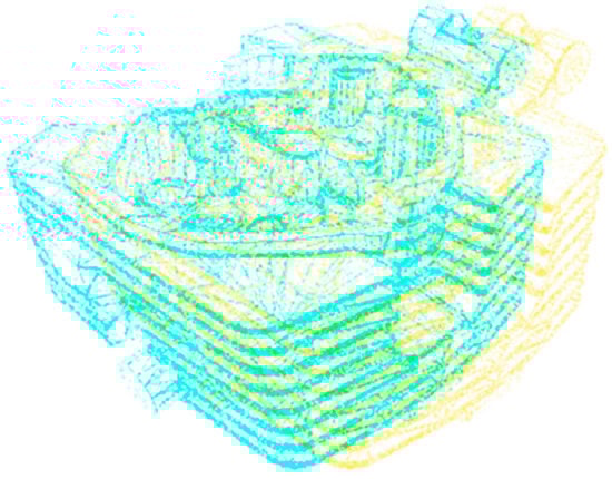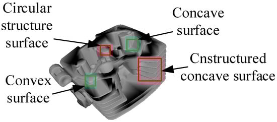 As shown in Figure 3, the casting structure is complex and contains a large number of features. Among these, the simple features of the circular surface in the figure are not obvious, and there are a large number of non-structural surfaces []. In addition to casting the convex outside surface, there are a large number of internal concave surfaces, which are the most difficult structural concave surface. These surfaces reduce the measuring accuracy and the grinding accuracy []. The existing method uses artificial measuring and polishing, and the combination of mechanical and intelligent methods to conduct the processing is still in the experimental stage.