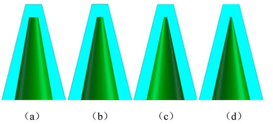 The change of the outer dimensions of the mold with the use of time (a) initial state (b) wear after a short period of use (c) wear after a longer period of use (d) failure state.