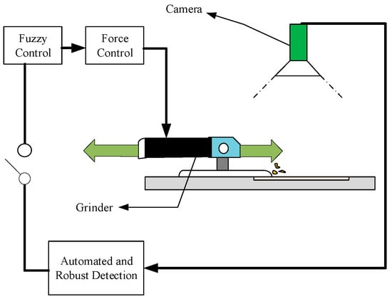 Manual grinding can be based on the actual situation, in which observation and measurement need to be made after the completion of a process, and the subsequent grinding strategy can be adjusted after real-time comparison of drawings and the size. With the extensive use of machine vision, humanoid real-time feedback and intelligent planning of the grinding strategy can be realized. With the support of artificial intelligence technology, vision sensors have been applied in a wide range of intelligent applications, which have played a positive role in inspiring the improvement in the grinding process []. Vision sensors have the advantages of non-contact detection, high precision, strong repeatability, fast speed, good stability, and low cost [].