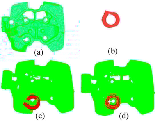 Figure 14a shows the data template of a workpiece to be polished obtained by a sensing device; Figure 14b shows the local template features of the workpiece to be polished; Figure 14c shows the approximate location of B in a rough registration; and Figure 14d shows the precise location of B in A through fine registration. After registration, it is convenient for grinding tools to plan the machining route of the workpiece, which can greatly improve the machining accuracy. High-precision matching is essential for automatic grinding.