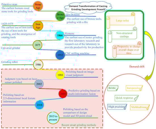 In the Stone Age, stone grinding [] was mainly used to make various knives, stone axes, and other tools. In the Bronze Age [], as the first country to employ copper smelting, China mastered the advanced casting post-processing technology. The rasp was used to compensate for casting defects, make the casting surface smooth, and make weapons and tools sharper and more polished []. After entering the Iron Age, rotary grinding tools appeared [], which provided a reference for subsequent mechanical grinding. With the emergence of iron tools and rotary tools, and the advent of the first Industrial Revolution after the emergence of the steam engine, the manufacturing materials were mainly cast iron. Although casting products have changed, the grinding method still used manual grinding. Siemens developed the generator in 1866, providing technical support for mechanical grinding. In 1914, sandpaper developed by 3M in the United States resulted in a new grinding tool for post-processing for castings. Development subsequently entered a period of combining artificial and mechanical grinding in the post-processing of castings, which has continued until now.
