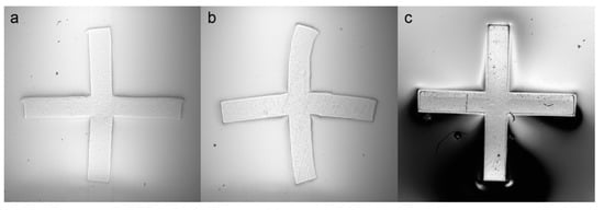 Post-exposure bake for ADEX wafers was performed by inserting exposed wafers directly into an oven preheated to 95 °C. After the required duration (Table 1), the oven was switched off and allowed to cool to room temperature. However, rapid temperature changes during the post-exposure bake were observed to produce deformation of SUEX features (Figure 1). Consequently, exposed SUEX wafers were inserted into the oven at 50 °C and the temperature was increased to 85 °C over 30 min. After remaining at 85 °C for an hour, the oven was slowly cooled to room temperature at a rate of 20 °C per hour.