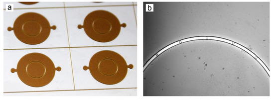 - Wangler, N.; Gutzweiler, L.; Kalkandjiev, K.; Müller, C.; Mayenfels, F.; Reinecke, H.; Zengerle, R.; Paust, N. High-Resolution Permanent Photoresist Laminate TMMF for Sealed Microfluidic Structures in Biological Applications. J. Micromech. Microeng. 2011, 21, 095009. [Google Scholar] [CrossRef]