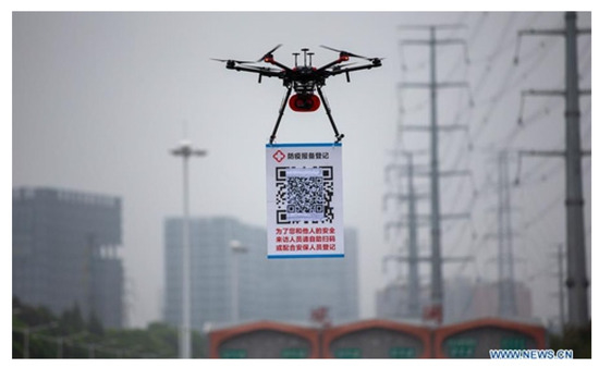 | [45] | China | Drone mounted with a speaker to inform the public to wear a mask |