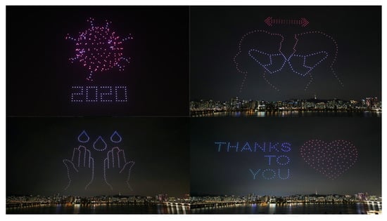 52]. In Seoul, South Korea, hundreds of drones performed a show displaying messages to support the country in the fight against COVID-19. The show started with showing precautionary steps and ended with showing gratitude to medical personnel and the public for their collective efforts against COVID-19, as shown in
