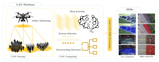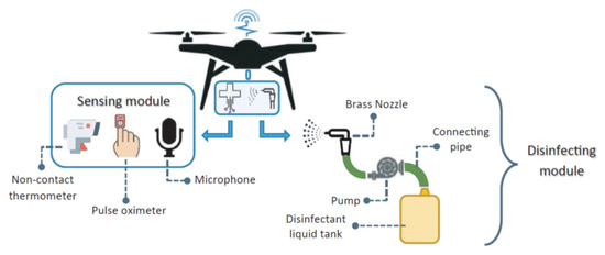 1], the authors proposed Covidrone, which uses biomedical sensors to collect medical information from people linked to COVID-19. A sensor module, a disinfection module, testing kits, a wireless communication system, and a DNN model are included in Covidrone’s payload, as shown in