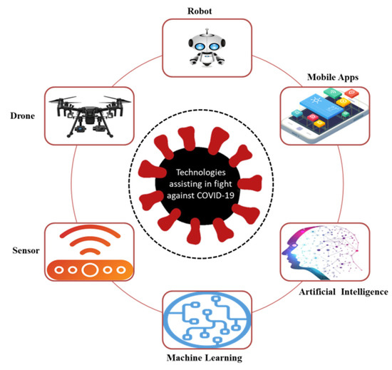 4] has increased significantly throughout the pandemic to bear the burden of frontline health system soldiers. Robotic and drone technology has been set up to help with monitoring, early infection screening, transportation of medical supplies, disinfection, and other processes. Robotics has also been extensively used to provide patients and healthcare professionals with medical advice. AI has been used in forecasting areas with infection concerns, prescribing medication, computing diagnosis findings, and other applications because of its capacity to operate independently, self-learn to improve with the addition of fresh data, and draw imperatives in short periods of time. Even the mobile phone network is seen as a crucial tool for combating the pandemic condition. Mobile phone technology is now widely used in cities and digitally connects people to bigger populations. Smartphone apps (Apps) have been used as the ideal model to interact with wider populations since mobile phone networks have been compared to the veins of cities. Numerous smartphone apps have been created to raise awareness, offer medical help, and most importantly, stop the COVID-19 virus from spreading by tracing contacts. Authorities are concentrating on the adoption of protective measures and quick testing techniques as we prepare to walk out and restore normalcy to everyday life. In this sense, the usage of face masks has shown to be successful in reducing the COVID-19 virus’s ability to propagate. Due to the unexpected increase in mask demand, new advancements in mask manufacturing technology have been made. A defensive line against COVID-19 has been established thanks to the collaboration of several industries, the use of technology, and competent governance. Understanding how these advancements are working together to tackle the pandemic crisis is crucial given the technology’s astounding contribution to the fight against COVID-19 infection. In