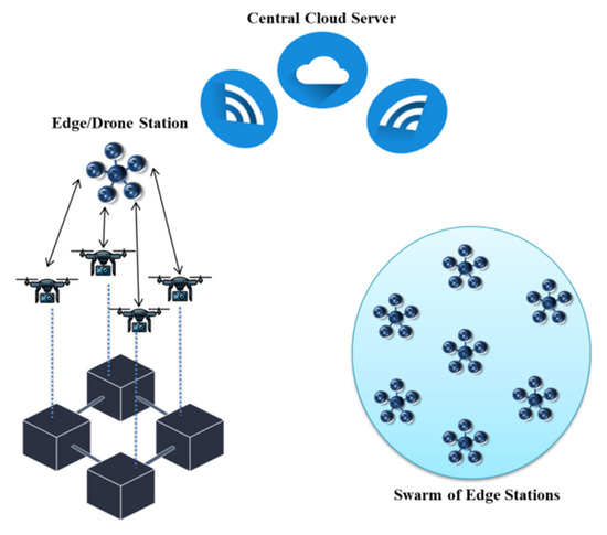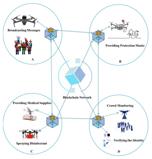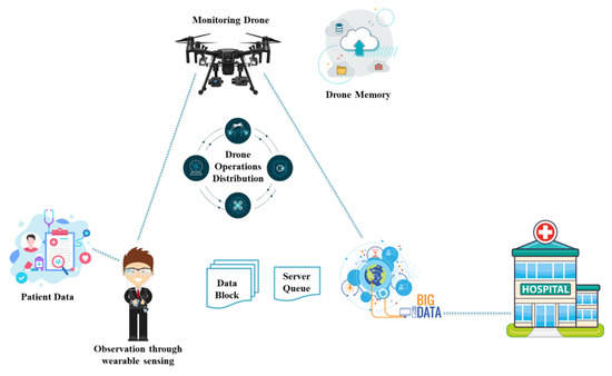 Figure 10. Such drones could land in strategically chosen areas and wait for customers who needed their services again. Smart medical sensors on the drone acquire the necessary medical data after authenticating the user and disinfecting the sensing apparatus. Subsequently, a DNN-based model receives these medical data for COVID-19 identification and analysis. Based on the results of his or her test, the user will be advised to take additional medicine or take preventative measures. These test results would be accessible to remote medical workers via cloud services for additional analysis. The elimination of human touch due to process automation aids in the fight against COVID-19. This strategy can give older and physically challenged people access to crucial medical care and testing facilities. Covidrone is expected to help significantly in lowering COVID-19 curves, especially in remote areas where there are not many places to receive medical help.