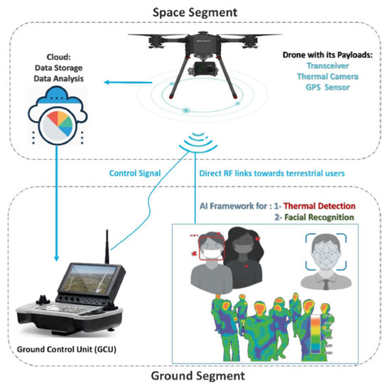 37] used a drone swarm in a specific area. A camera and sensor were mounted on the ground to capture videos and a real-time view of that area. The medical staff operating through GCS can trace infected people through thermal cameras. Cameras can also monitor social distancing, as shown in
