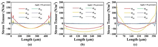 The stress distribution of (a) square diaphragm; (b) length direction of I-shaped diaphragm; (c) width direction of I-shaped diaphragm.