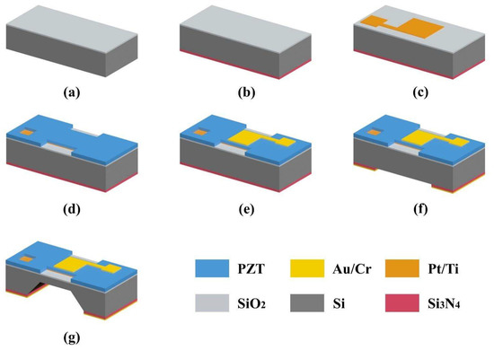 As shown in Figure 4, the pMUT with an I-shaped diaphragm was fabricated using the MEMS method. The (100) silicon substrate was coated with 0.2-μm-thick silicon oxide using thermal oxidation. As shown in Figure 4a, the backside silicon oxide was then etched. As shown in Figure 4b, a 0.6-μm-thick silicon nitride (Si3N4) layer was then deposited on the backside as part of the bulk silicon etching mask layer. The Pt/Ti bottom electrode was then deposited and patterned on the silicon oxide layer, as shown in Figure 4c. Next, a PZT piezoelectric layer was prepared using the 0–3 method and patterned as shown in Figure 4d. The top electrode Au/Cr was then deposited on the PZT layer and patterned, as shown in Figure 4e. As depicted in Figure 4f, after deposition of the Au/Cr films, an Au/Cr/Si3N4 composite mask for bulk silicon etching was fabricated by successively etching Au/Cr and Si3N4 films. As shown in Figure 4g, the silicon substrate was etched by wet bulk silicon to form a silicon diaphragm by controlling etching time. Finally, the device preparation has been completed.