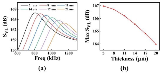 The pMUT with I-shaped diaphragm: (a) transmitter voltage response curve graph; (b) variation of transmitter voltage response at resonant frequency with piezoelectric layer thickness.