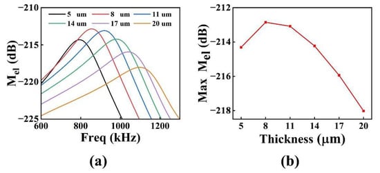 Figure 5 depicts (a) the transmitter voltage response and (b) the variation of the transmitter voltage response at resonant frequency with different piezoelectric layer thickness for the pMUT with an I-shaped diaphragm. As the thickness of the PZT piezoelectric layer increased, the bending stiffness of the diaphragm also increased, resulting in a gradual increase in the resonant frequency of the pMUT. At the same time, the effective bending decreased, resulting in a decreasing trend in the transmitter voltage response.