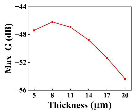 Figure 7 shows the variation of the loop gain (loss) at resonant frequency with the thickness of the piezoelectric layer for the I-shaped diaphragm pMUT. As the thickness of the PZT piezoelectric layer increased, the loop gain (loss) initially increased, then decreased. The maximum loop gain (loss) of the pMUT was −46.17 dB when the piezoelectric layer PZT had a thickness of 8 μm, which corresponds to the highest receiving sensitivity.