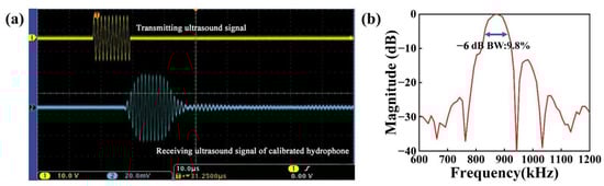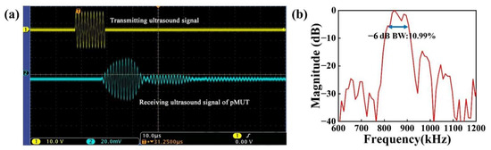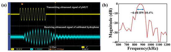 The waveform of the signal received by the developed pMUT is shown in Figure 8a (the x-axis scale stands for 4.00 μs; the y-axis scale of the transmitting ultrasound signal and receiving ultrasonic signal stands for 10.0 V and 1.00 mV, respectively). After calibration, the transmitting sensitivity of the pMUT was 2.1812 Pa/V, i.e., 126.77 dB (ref. 1 μPa/V) at 20 mm equivalent distance. As shown in Figure 8b, the calibrated hydrophone had a −6 dB bandwidth of 10.4% with a center frequency of 870.52 kHz.