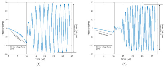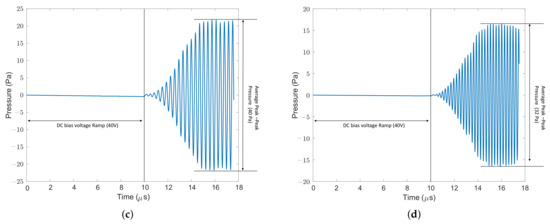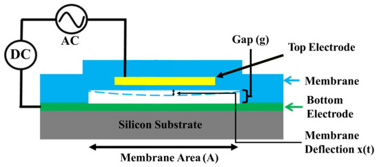 where A is the membrane area, ε is the permittivity of free space, g is the initial gap size between the two electrodes, x(t) is the vertical displacement of the membrane due to the electrostatic force, and is the voltage signal which has both DC and AC components (Equation (2)). The AC component in the voltage signal is responsible for generating the acoustic wave.