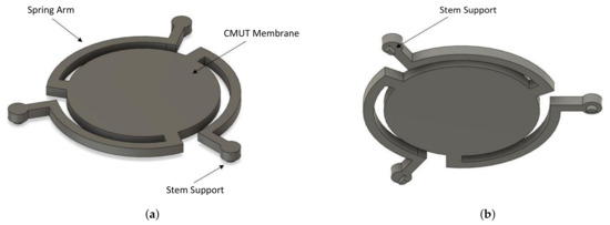 Four alternate CMUT topologies were designed in this study to assess and compare the impact of the spring-arm geometry and anchoring method, as detailed in Table 1. The simulation results of the four topologies provide the performance characteristics useful to assess the incidence of the novel features introduced.