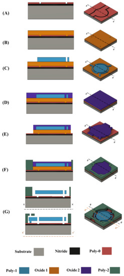 The CMUT and the array were designed according to PolyMUMPs guidelines and were taped out for implementation. Figure 3 shows cross-sections and 3D views of each main step of the fabrication process for a CMUT device.