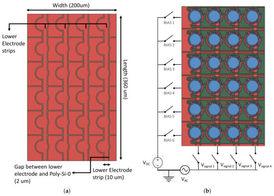 Top View of CMUT array. (a) Array dimension; (b) full array topology and electrical actuation setup.
