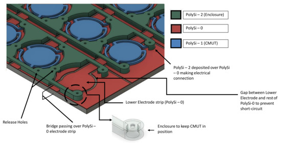 As a proof of concept, we propose the design of a CMUT array consisting of 6 × 4 CMUT units occupying only a 360 × 200 μm substrate footprint (Figure 4a). As illustrated in Figure 4b, Poly-0 serves as the main electrical routing layer for the array. Longitudinal conductive strips carry the AC signal to the bottom electrode of the selected column(s). The remainder of the layer is arranged into islands that are electrically connected in horizontal rows by means of Poly-2 bridges joining adjacent stem enclosures. These row electrodes serve to direct DC bias and AC ground to the bottom electrode of CMUT elements on the selected row(s). Electrical connection from the Poly-0 island to the Poly-1 membrane is ensured by mechanical contact with the support stems. The array routing strategy makes it possible to activate each CMUT element independently by activating the appropriate row and column coordinates. Figure 5 details the geometric structure of the proposed CMUT array system.