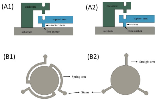 In the novel CMUT design, embodied in CMUT A of Figure 2, the suspended membrane is connected by spring arms (as shown in configuration B1 of Figure 6) to rocking support stems (as shown in configuration A1 of Figure 6). As highlighted in configuration A1, rocker stems are not fixed and are free to slide on the inferior layer, as highlighted in Figure 6. Conversely, a conventional CMUT (as embodied by CMUT D) is implemented by combining the fixed anchor stems of configuration A2 and the straight arms of configuration B2, as shown in Figure 6.