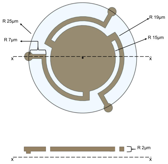 During actuation of the device, due to the electrostatic force between the membrane and the fixed electrode caused by a DC bias, the membrane is attracted downwards toward the electrode. Downward deflection of the membrane also causes bending and twisting strain in the spring arms. Since the structure is supported at the stems, which are free to slide, but held down by static friction, only a small point or edge at the base of the stem will act as a pivot and will allow the device to rock about it. Static simulation was performed to evaluate the reaction forces on the rocker stem for CMUT A at 40 V DC electrostatic actuation. Normal (vertical) reaction force and radial outward force were determined to be 1.6 μN and 0.28 μN, respectively. The minimum static friction coefficient between silicon compounds can be estimated at 0.2 as per [20]. Since the resisting frictional force is greater than , it can be concluded that the rocker stem will remain static on the bottom surface, hence losing no energy to friction and avoiding any wear or tear. This novel approach is more efficient, since losses in the form of heat are greatly reduced [21,22], leaving more energy for the displacement of the membrane compared to devices with traditional anchoring (fixed stems). Since this approach minimizes effective stiffness, the resonance frequency is also lower compared to traditional anchoring for a similar footprint. The material properties and dimensions of the designed CMUT are provided in Table 3 and Figure 7.