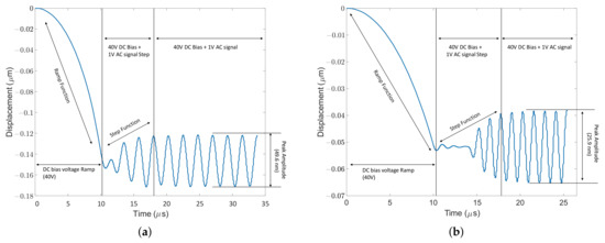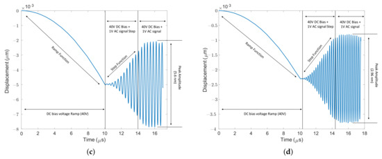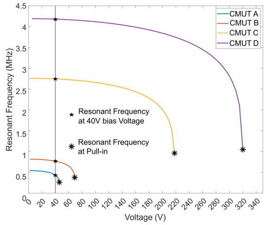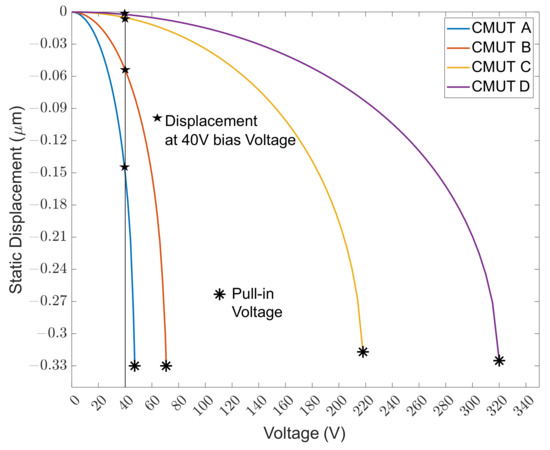 Displacement efficiency is calculated as the peak–peak displacement per AC signal volt. The maximum displacement efficiency for the four designed CMUTs is 49.6 nm/V, 25.9 nm/V, 5.6 nm/V, and 2.96 nm/V for CMUT A, B, C and D, respectively. In comparison, CMUTs designed by [27,28] showed a displacement efficiency of 3.51 nm/V and 9 nm/V, respectively.