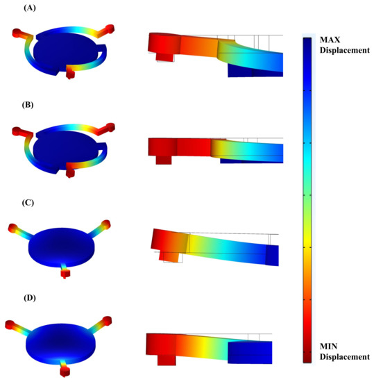 Scaled-up deformation of CMUTs under operation. (A) CMUT A. (B) CMUT B. (C) CMUT C. (D) CMUT D.