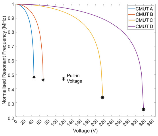 DC voltage vs. normalized resonant frequency for CMUTs.