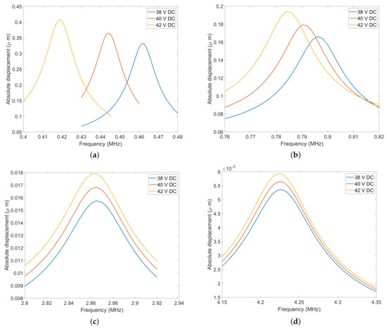 Displacement vs. time graphs are shown for CMUTs A, B, C, and D in Figure 12. The peak-to-peak displacement decreases from CMUT A to CMUT D because the common DC bias voltage selected (40 V) is closest to the collapse voltage of CMUT A and farthest from that of CMUT D. The peak-to-peak displacement for all CMUTs is provided in Table 4, proving that it is crucial to operate a CMUT close to its collapse voltage for maximum power efficiency. Since portable CMUT applications are restricted to low voltages, the novel designs of CMUTs A/B with their low collapse voltage can find utility. The frequency response of CMUTs was simulated as a function of different bias voltages. Figure 13 shows the frequency response of the four CMUT topologies at 38 V, 40 V and 42 V DC bias.