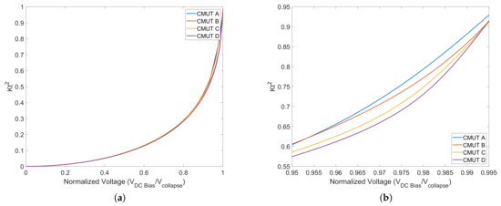 The above result is important because near the collapse point (g/3), the coupling coefficient approaches unity, indicating that all the energy in one domain is converted to the other domain. Electromechanical coupling coefficient as function of voltage normalized to collapse voltage is shown in Figure 15. Figure 15a shows the electromechanical coupling coefficient as a function of bias voltage for the four CMUT types. The maximum difference between coefficients for CMUTS is close to the collapse voltage where they are operated. Higher electromechanical-coupling coefficient values can be seen for CMUT A followed by CMUT B, C, and D in Figure 15b. This is a result of CMUT A being able to convert electrical energy to mechanical (acoustic) energy more efficiently due to reduced energy losses in the anchors. The figure confirms that CMUT A is a more efficient device.