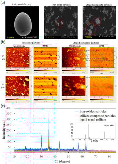 | Properties-Sample Sizes (Test Conditions) | Utilized Composite Particles | Iron–Oxide Particles | Liquid Metal Ga | |||